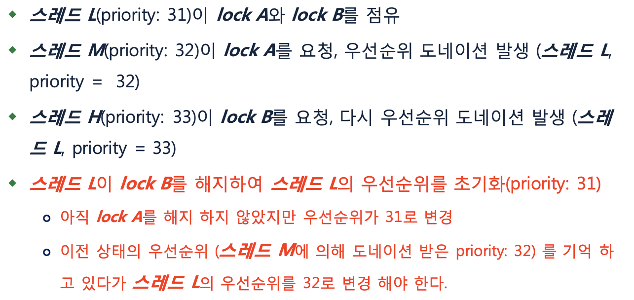 스레드가 두 개 이상의 lock 보유 시, 각 lock에 의해 도네이션 발생 가능 → 이전 상태의 우선순위 기억하고 있어야함!