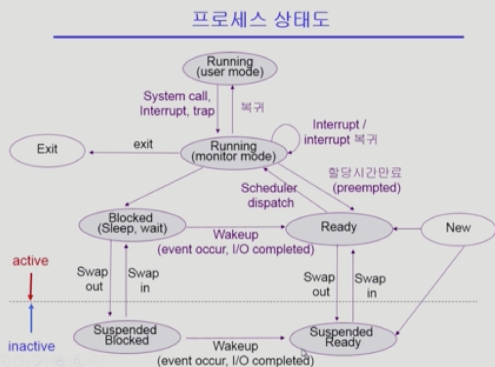 - Blocked(wait, sleep) : CPU를 주어도 당장 instruction을 수행할 수 없는 상태, Process 자신이 요청한 event(예 : I/O)가 즉시 만족되지 않아 이를 기다리는 상태