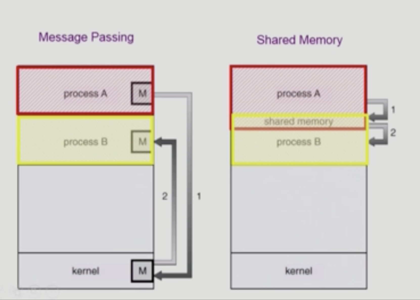 - 메시지를 전달하는 방법(message passing) : 커널을 통해 메시지 전달 (직접 X)