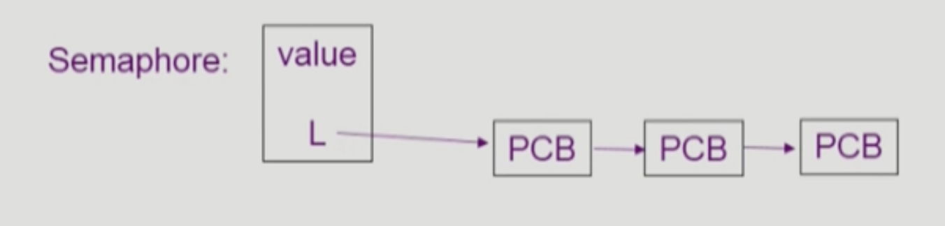 typedef struct { int value; /* semaphore 변수 값 */ struct process *L; /* semaphore때문에 잠들어있는 프로세스들을 연결하기 위한 큐! */ }semaphore;block : 커널은 block을 호출한 프로세스를 suspend시킴, 이 프로세스의 PCB를 semaphore에 대한 wait queue에 넣음 (semaphore를 획득할 수 없으면 그 프로세스를 block 시킴)