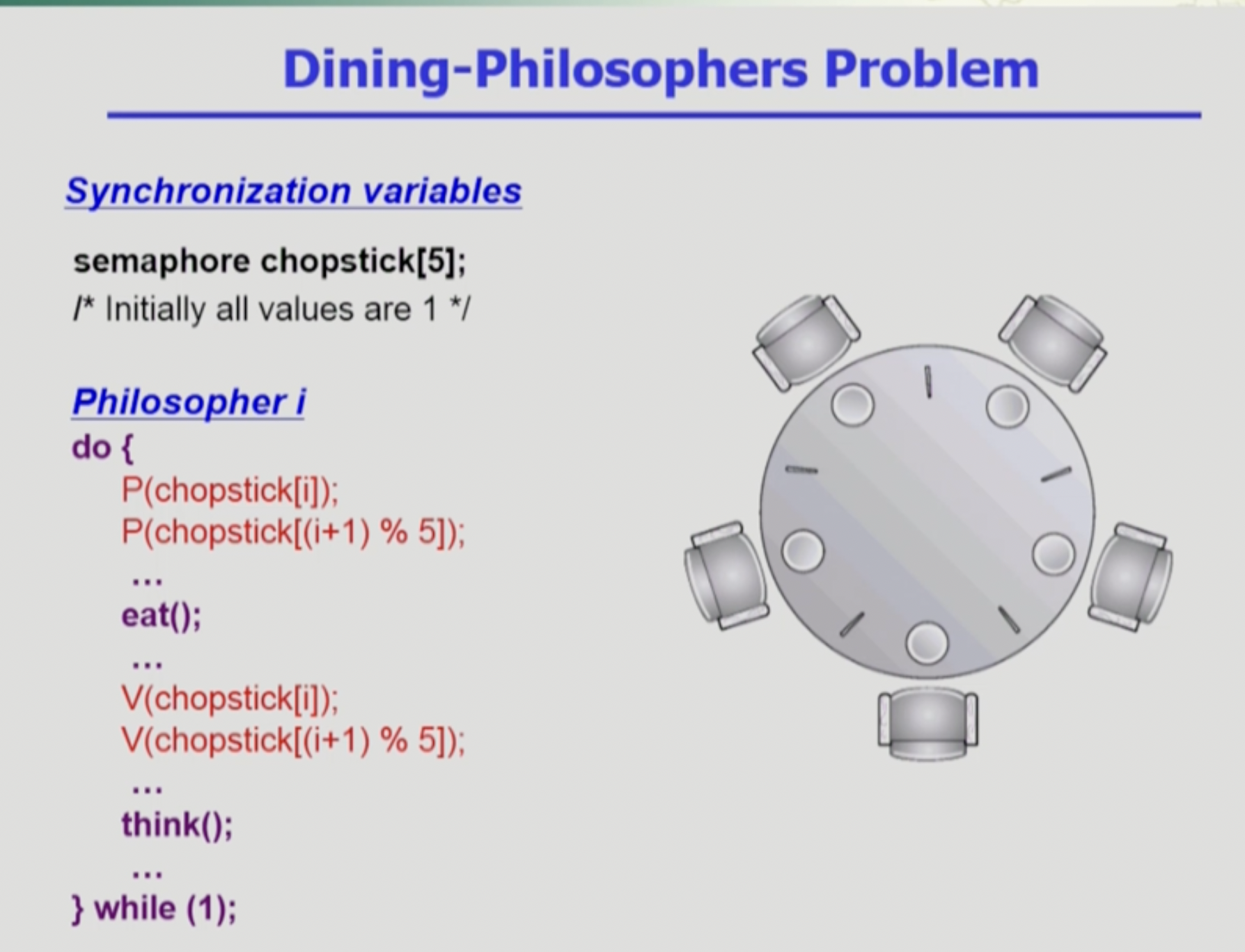 Synchronization variable semaphore mutex; /* initially 1: 1개가 CS에 들어갈 수 있다 */ Process Pi do { P(mutex); //lock을 걸때 CS에 들어가야하면 P연산을 해주고, critical section V(mutex); //빠져나올 때에는 V연산 해줌 remainder section }while(1);busy-wait는 효율적이지 못함(=spin lock)