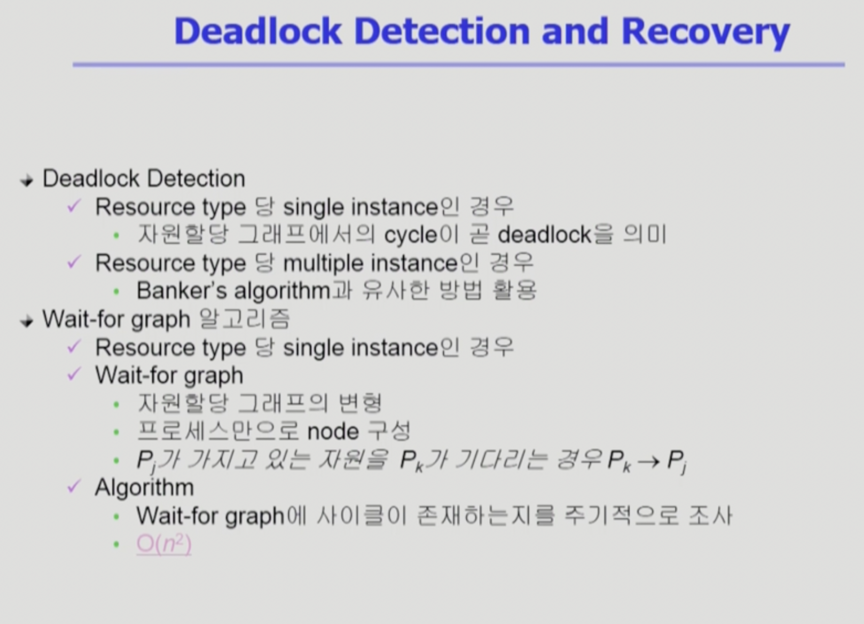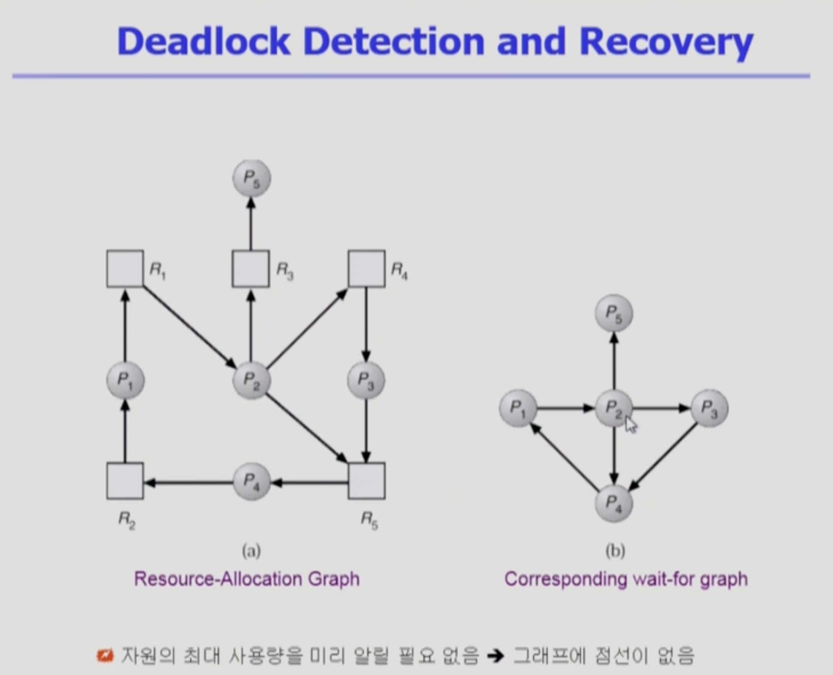 Deadlock 발생은 허용하되 그에 대한 detection 루틴을 두어 deadlock 발견 시 recover