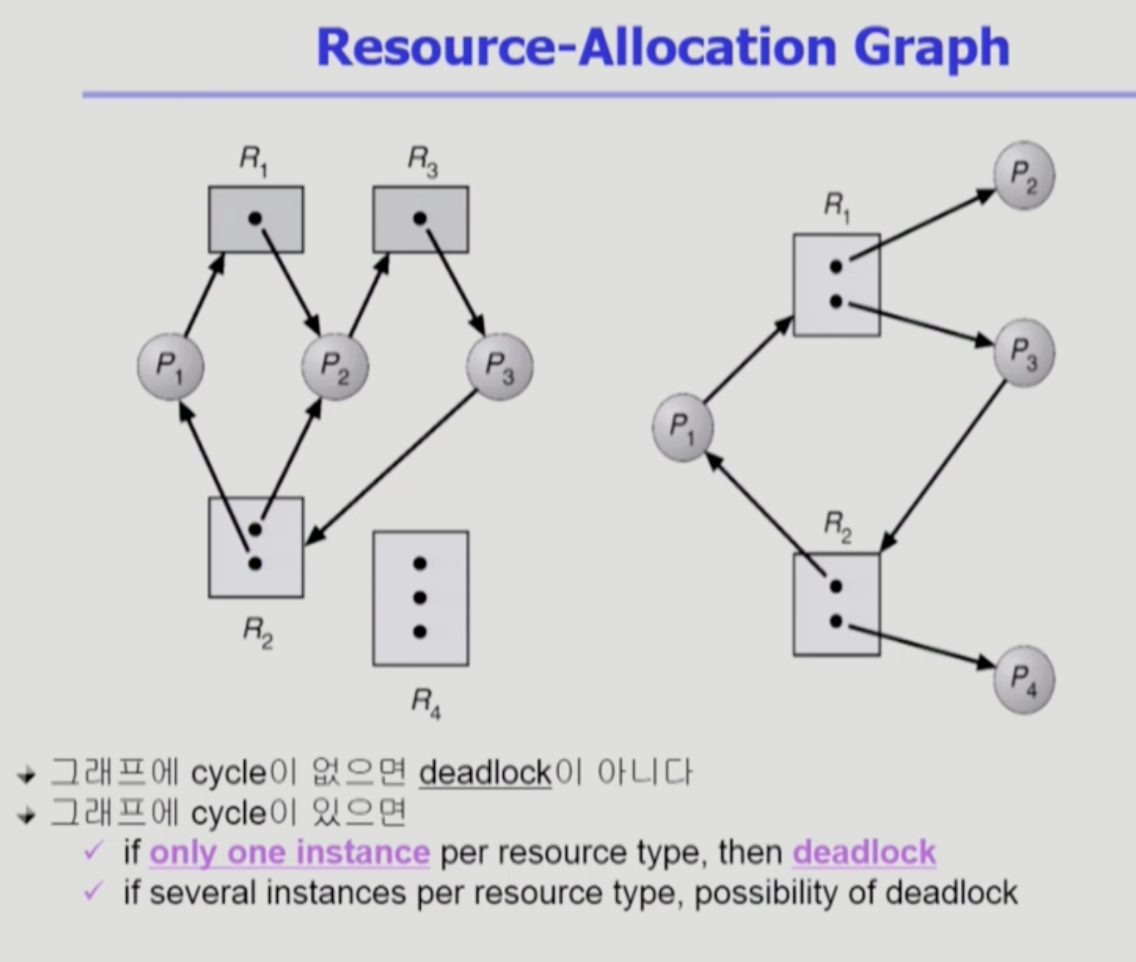 오른쪽은 데드락은 아님 : 자원이 2개가 있는데 하나는 3번한테 가있고, 3번은 2번한테 요청했는데 하나는 1번한테 가있고, 4번한테 가있음 만약 자원이 한개뿐이였으면 데드락이 만들어 졌을 것, 여분의 자원이 더 있고 그 여분의 자원은 2번프로세스와 4번 프로세스가 가지고 있는데 이건 데드락에 연류된 프로세스는 아닌것, 4번프로세스가 자원을 가지고 있지만!, 쓰고나서 반납을 하면 자원이 available 해지고 그때 자원을 3번 프로세스한테 줄 수 있으니!