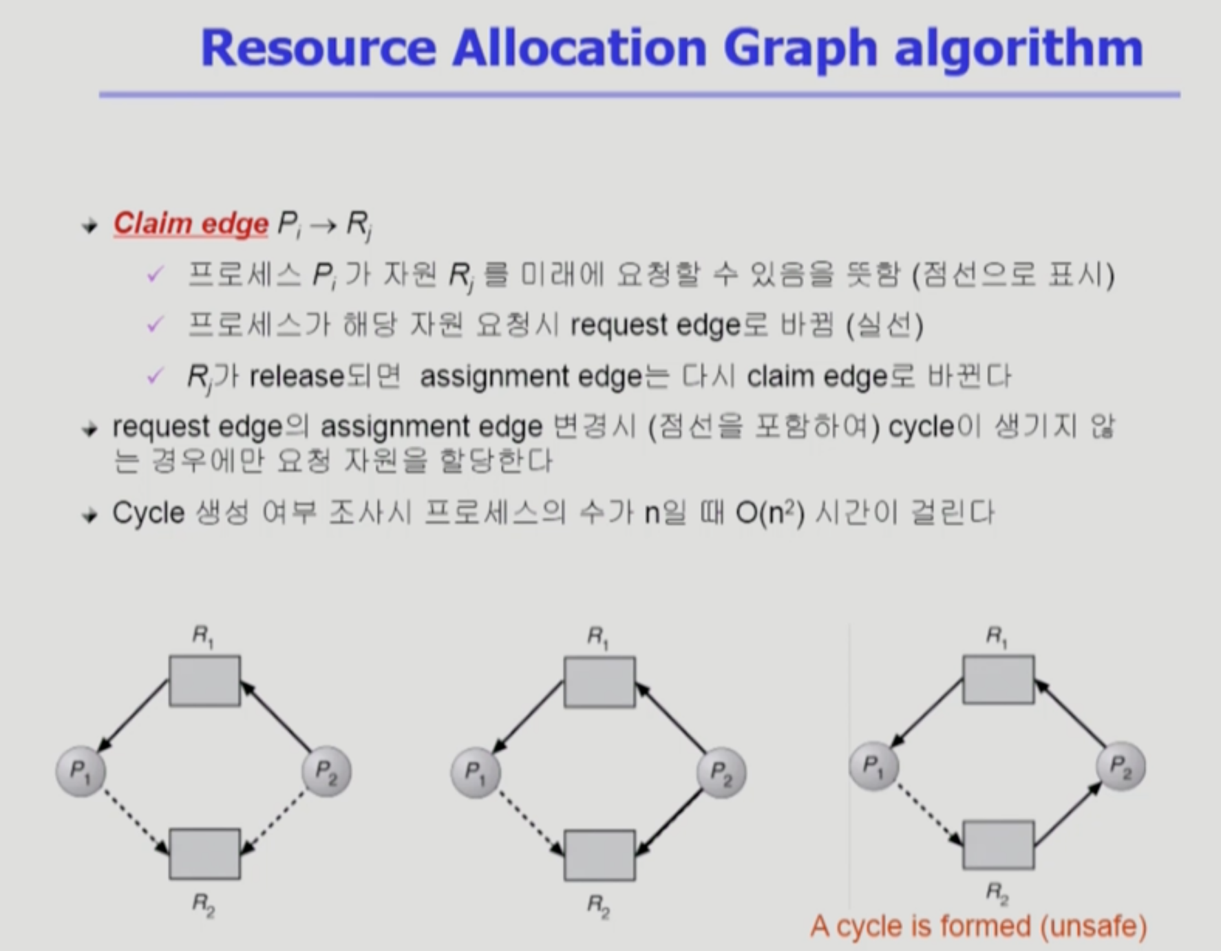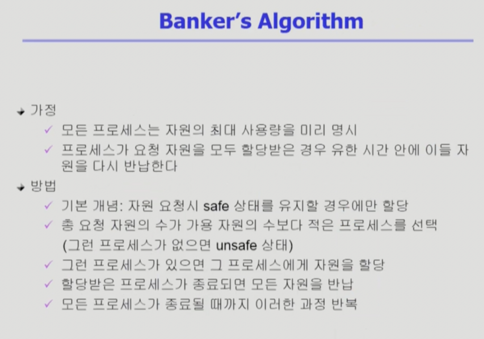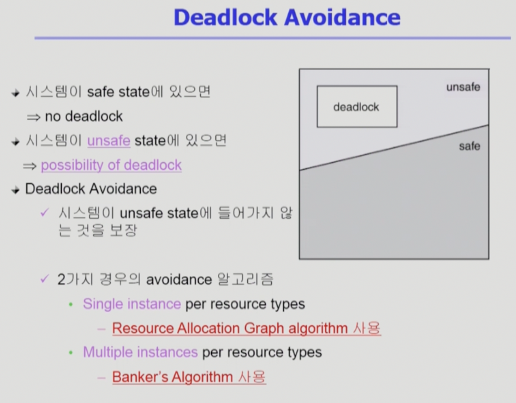 - 자원 요청에 대한 부가적인 정보를 이용해서 자원할당이 deadlock으로 부터 안전(safe)한지를 동적으로 조사해서 안전한 경우에만 할당