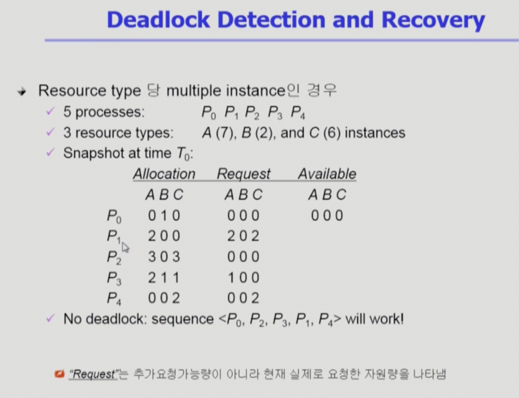 P2는 현재 요청된게 000인데 여기서 다 반납할거라고 낙관적으로 가정을 할것임. 즉 그럼 available이 3 0 3이 생기겠지 이런식으로 아무것도 요청하지 않은 자원이 반납할 것을 가정해서 쌓고 쌓아서!! 요청된것들을 다 허용을 하고 요청된것들도 반납한다는 생각으로 이 시퀀스가 존재를 하면 데드락이없다!
